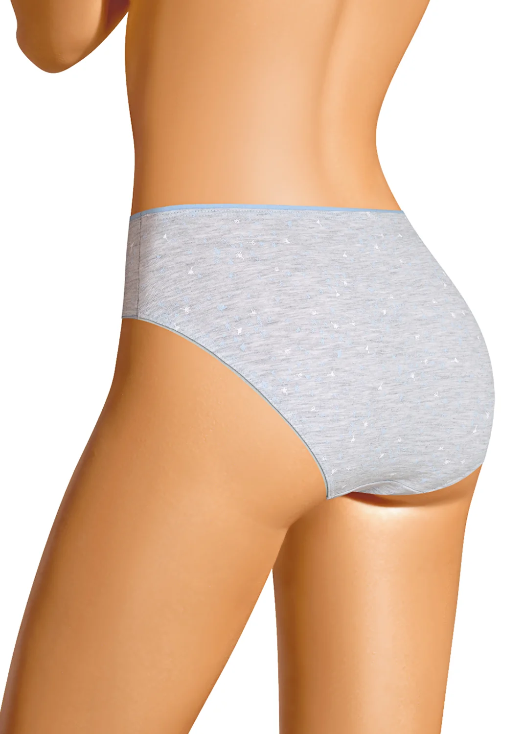 Трусы слипы женские из эластичного хлопкового полотна. Обработка краев по талии- резинка с кантом, по ноге - полуокантовка. По переду атласный бант. меланж св.серый/св.голубой