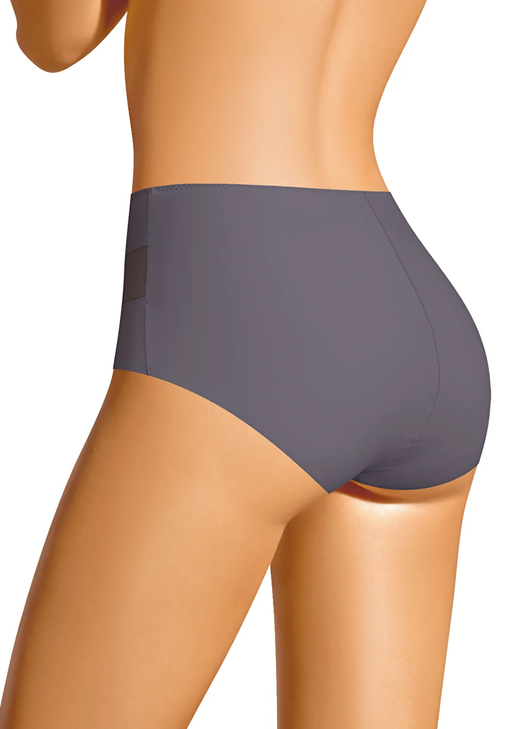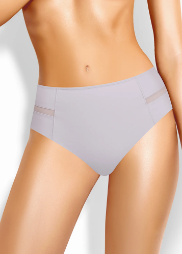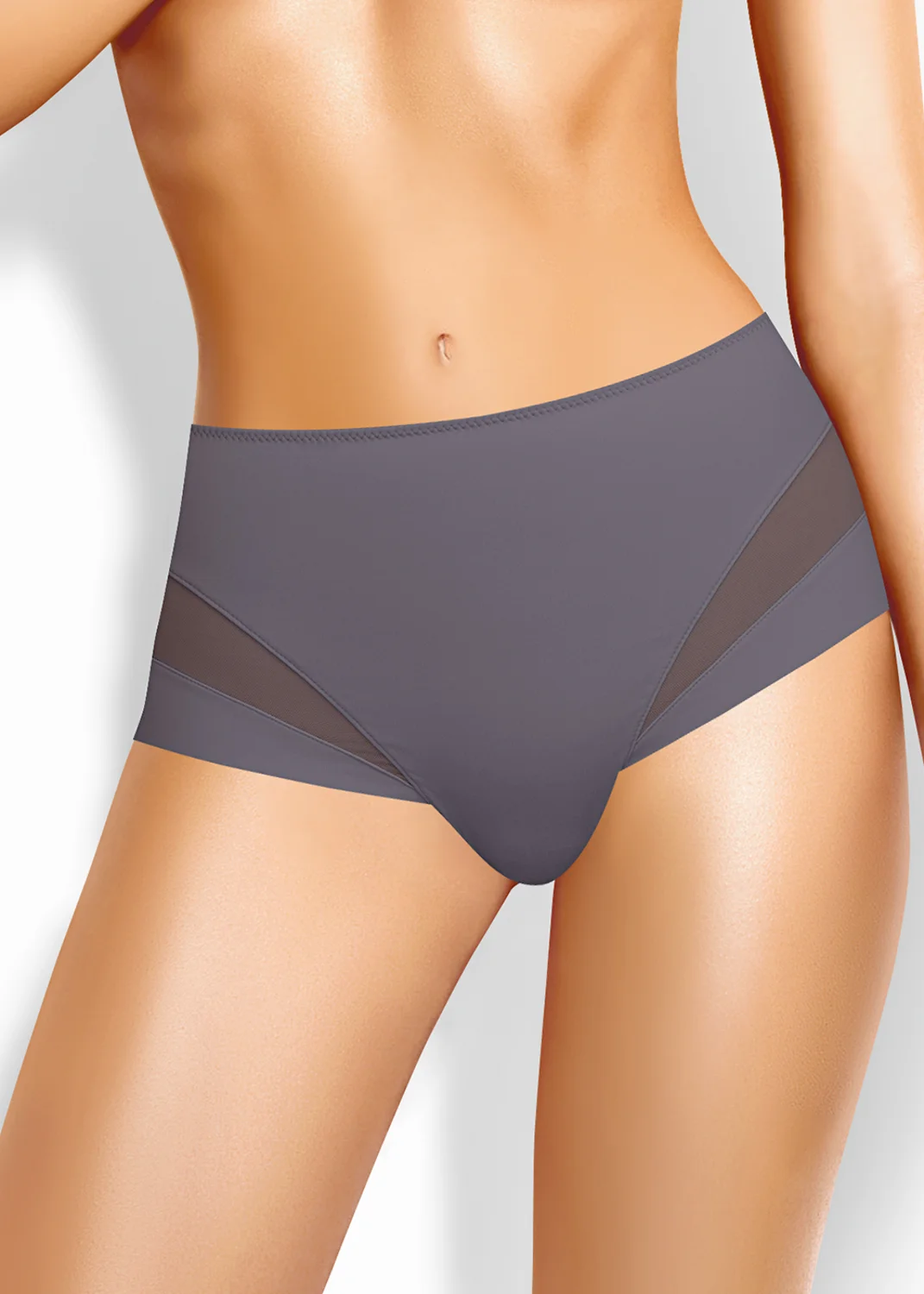 Трусы слипы с завышенной посадкой, сзади и по линии бикини бесшовная гладкая обработка, спереди декоративные диагональные вставки из плотной сетки, перед дублирован сеткой, по талии обработка с зигзагом и узкой резинкой т.серый