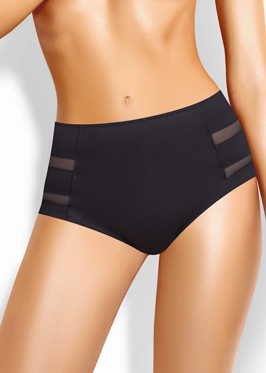 Трусы слипы с завышенной посадкой, сзади и сбоку бесшовная гладкая обработка, спереди декоративные горизонтальные вставки из плотной сетки, перед дублирован сеткой, по талии обработка с зигзагом и узкой резинкой. чёрный