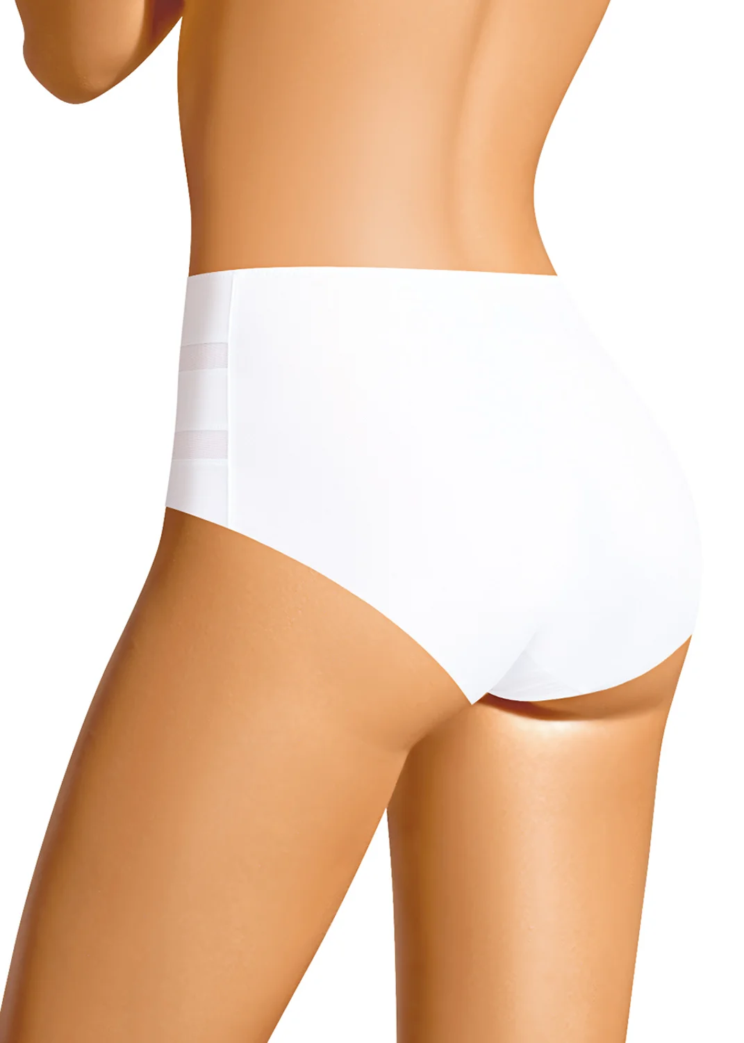 Трусы слипы с завышенной посадкой, сзади и сбоку бесшовная гладкая обработка, спереди декоративные горизонтальные вставки из плотной сетки, перед дублирован сеткой, по талии обработка с зигзагом и узкой резинкой. белый