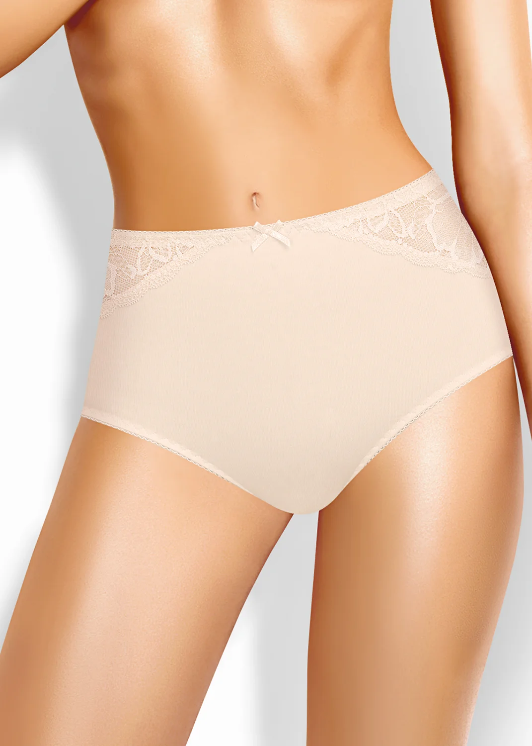 Трусы макси женские из эластичного хлопкового полотна. По переду кружевные вставки. Обработка краев по талии и ноге - ажурная резинка с фестоном, точечный зигзаг. По переду атласный бант. св.бежевый