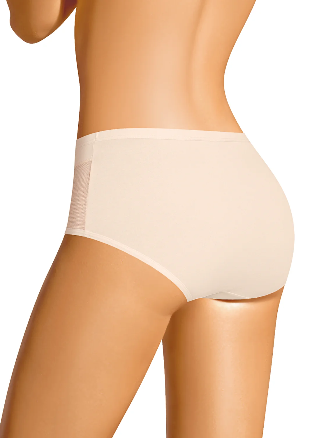 Трусы макси женские из эластичного хлопкового полотна. Обработка краев по талии жаккардовая резинка, по ноге - полуокантовка. По переду боковые вставки из сетки, швы застилом. св.бежевый
