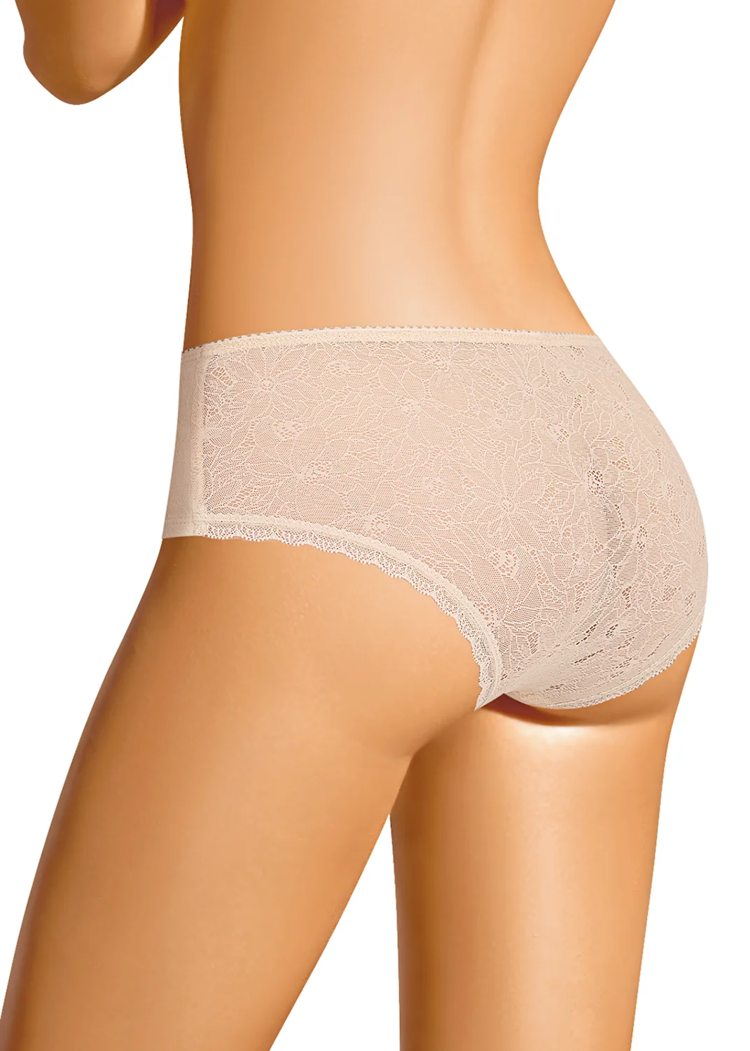 Трусы шорты женские из ажурной сетки. Перед и ластовица дублируются по изнанке эластичным хлопковом полотном. Обработка краев по талии - ажурная резинка, по ноге переда - подгибка, по ноге спинки - узкое кружево. По переду атласный бант. св.бежевый