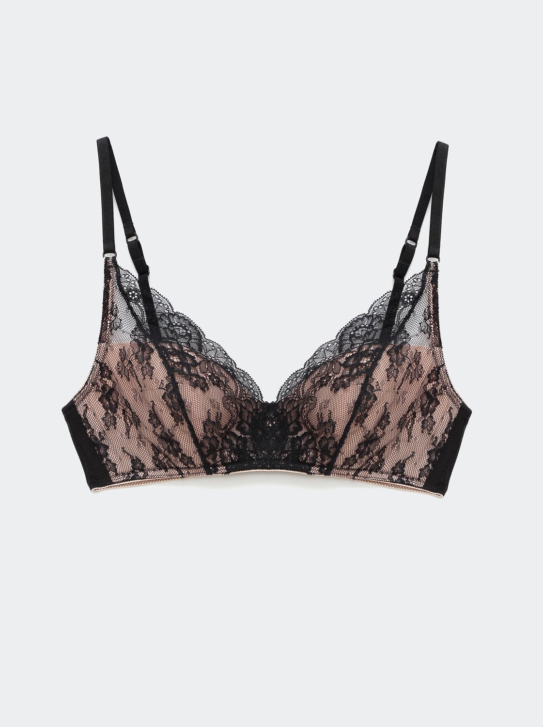 Бюстгальтер из эластичного сетчатого полотна, неэластичного кружевного полотна и неэластичного кружева. Без каркасов.