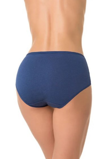 Оптовая продажа. Трусики слипы женские синего цвета, однотонные, из деликатного хлопкового полотна с добавлением спандекса, повышающий прочность и качество одежды, обладающий высокой гигроскопичностью, легкостью, не мнется. Имеют завышенную посадку, мягкую и эластичную резинку по талии, удерживающие трусы во время носки. Декорированы кружевной вставкой с цветочным рисунком и декоративным бантиком. Гигиеничная хлопковая ластовица позволяет избежать трения и раздражения кожи. Удобная и комфортная модель для повседневного белья.