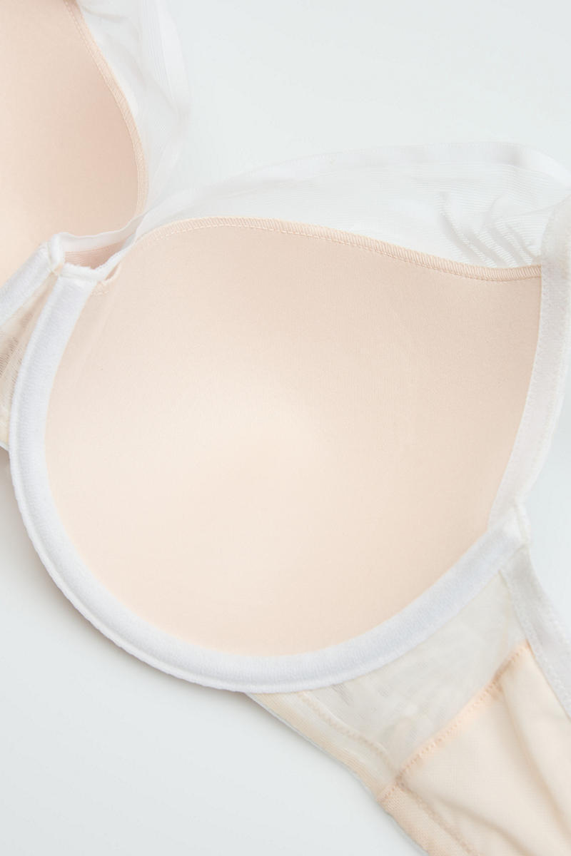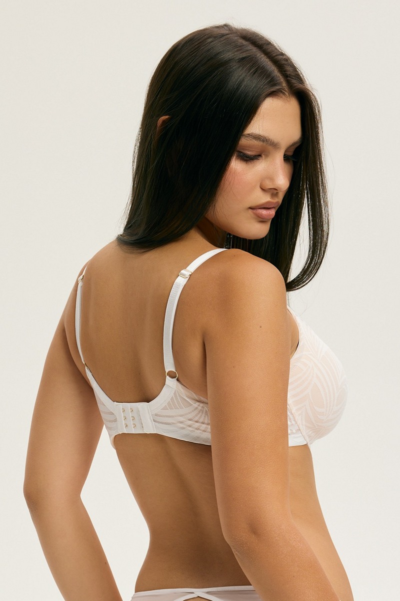 Бюстгальтер построенный на чашке Beautiful, привлекает внимание своей гладкой отделкой и тонкой прозрачностью. Эластичное кружево с геометрическим рисунком. Чашка из тонкого поролона на кости с несъемными регулируемыми бретелями обеспечивает комфорт и стабильность. Золотые детали. Состав: сетка 72% полиамид, 28% эластан; подклад чашки 100% полиэстер. 86% полиамид/ 14% эластан