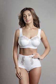 Бюстгальтер с мягкой чашечкой и диагональным швом, нижняя деталь с Т-образным швом из эластичного полотна и не эластичного кружевного и сетчатого полотна в верхней части чашечки, без каркасов.  Нижняя часть чашечки продублирована изнутри хлопковой основой. Спинка и стан выполнены из эластичного полотна. Бочек из эластичного полотна цельнокроен с передней частью бретели. Бюстгальтер имеет широкие разгрузочные бретели не стесняющие движений, которые снимают напряжение в области плеч благодаря уплотненной вставке из тонкого поролона. Бретель обтянута основной тканью. Задняя часть бретели выполнена из эластичной тесьмы. Регулятор длины бретели сзади. Высота бочка 12-17см. Застежка на два-три крючка, в зависимости от размера два-три варианта объема. Между чашечками на стане украшен маленьким бантиком.