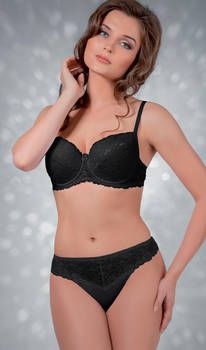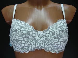 Бюстгальтер "балконет" с диагональным швом и  чашечкой на тонкой поролоновой основе, сверху обтянутой эластичным кружевным полотном, на каркасах. Стан, бочка и спинка выполнены из эластичного кружевного полотна. Стан продублирован изнутри сетчатой основой. Высота бочка 7-10 см. Регулятор длины бретели сзади. Застежка от 75В-75D, 80В,С на одном крючке, от 75Е, 80D-85Е на два крючка, два варианта объема. Между чашечками на стане украшен маленьким бантиком.