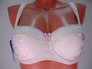 Бюстгальтер "балконет" гладкий с диагональным швом и  чашечкой на тонкой поролоновой основе, нижняя деталь с Т-образным швом, на каркасах. Стан, бочка и спинка выполнены из эластичного гладкого полотна. Стан продублирован изнутри хлопковой основой. Бюстгальтер имеет боковые косточки. Высота бочка 7-10 см. Регулятор длины бретели сзади. Застежка от 75С,75D на одном крючке, от 75Е- 100D на два крючка, два варианта объема. Между чашечками на стане украшен маленьким бантиком.