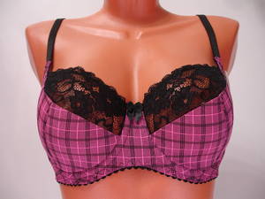 Бюстгальтер полупоролон с мягкой чашечкой и диагональным швом, нижняя деталь с Т-образным швом, на каркасах. Нижняя часть бюстгальтера гладкая, тонкая поролоновая основа, верхняя часть выполнена из эластичного кружевного полотна. Спинка, стан и бочка выполнены из эластичного полотна. Бюстгальтер имеет боковые косточки. Высота бочка 8 - 10см. Регулятор длины бретели сзади. Застежка на два крючка, два варианта объема. Между чашечками на стане украшен маленьким бантиком.
