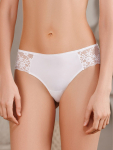 Трусы-бразильяна из микрофибры и узкого кружева. Передняя деталь дублирована хлопком. Высота бочка 4 см, средняя посадка. Коллекция "Fortuna".
