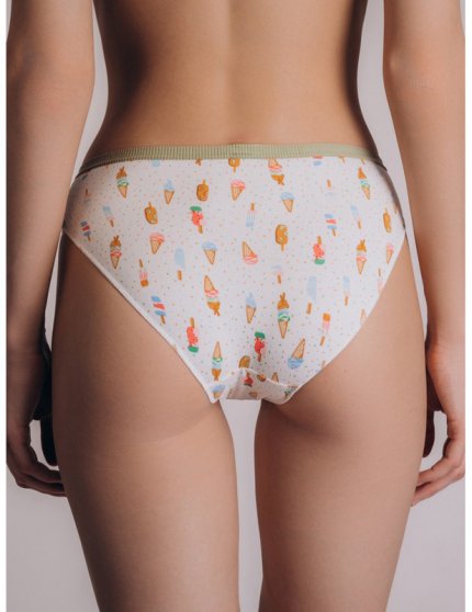 Оптовая продажа. Трусики слипы женские из натурального хлопка с добавлением эластана, повышающий прочность и качество одежды, создавая идеальное облегание фигуры. Имеют среднюю посадку, мягкую и эластичную резинку по талии, удерживающие трусы во время носки. Модель выполнена в молочном цвете с рисунком мороженое. Гигиеничная хлопковая ластовица позволяет избежать трения и раздражения кожи. Удобная и комфортная модель для повседневного белья. Рекомендуется бережная стирка при 30С.