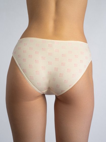 Оптовая продажа. Трусики слипы женские из натурального хлопка с добавлением эластана, повышающий прочность и качество одежды, создавая идеальное облегание фигуры. Имеют среднюю посадку, мягкую и эластичную резинку по талии, удерживающие трусы во время носки. Модель выполнена в кремовом цвете с рисунком розовые квадратики. Гигиеничная хлопковая ластовица позволяет избежать трения и раздражения кожи. Удобная и комфортная модель для повседневного белья. Рекомендуется бережная стирка при 30С.