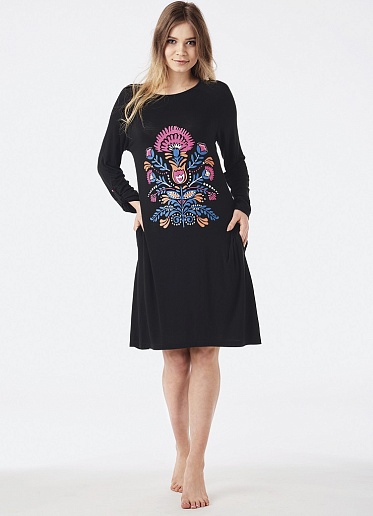 Сорочка женская для дома и отдыха LHD 585 18/19 из мягкого и шелковистого вискозного трикотажа. Многоцветный принт в народном польском стиле. Рукав закатывается, с фиксатором на пуговицу. Дополняют модель прорезные карманы. 95% вискоза/ 5% эластан