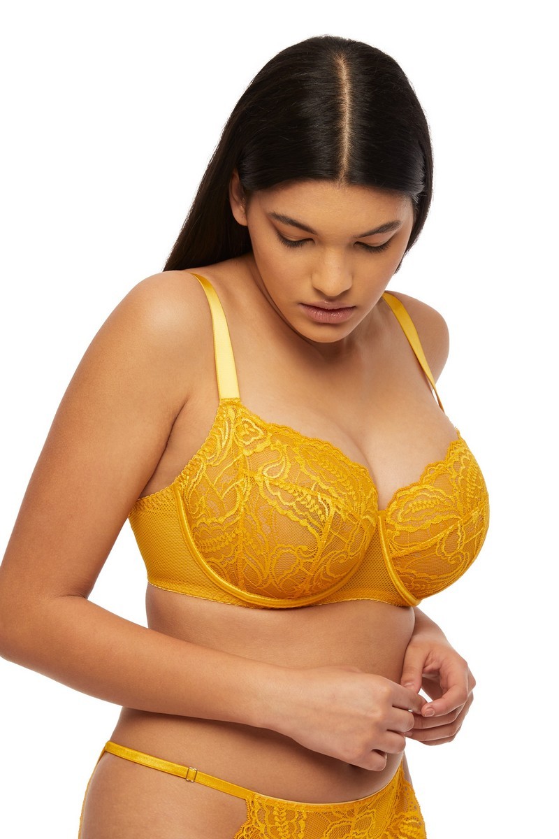Бюст 853-SC от европейского производителя Kinga. Элегантная модель в энергичном желтом цвете. Мягкая чашка на кости, отделанная итальянским кружевом с сеткой на подкладе из микротюля. Несъемные бретели, регулируемые по длине. 65% полиамид/ 25% полиэстер/ 10% эластан