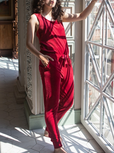 Женский комбинезон из домашней коллекции Opium. Выполнен из трикотажного бархатного велюра роскошного цвета бургунди. Заниженная линия талии оформлена кулиской на резинке и украшена шелковым бантом в тон. Удобные боковые карманы, брюки на манжетах. Эластичная ткань и достаточно свободный крой верха позволяют без труда снимать и надевать комбинезон. Стильная вещь для дома и отдыха.