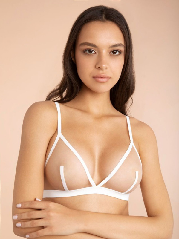 Бюстгальтер "триангл" из прозрачной сетки с контрастными вставками. Эластичная тесьма и гибкие боковые пластины создают отличную поддержку груди. бретели регулируются по длине. Модель подходит для повседневной носки и особых случаев.