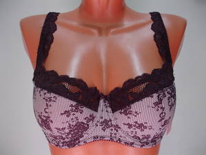 Бюстгальтер полупоролон с мягкой чашечкой и диагональным швом, нижняя деталь с Т-образным швом, на каркасах. Нижняя часть бюстгальтера гладкая, тонкая поролоновая основа, верхняя часть выполнена из эластичного кружевного полотна. Спинка выполнена из эластичного полотна. Стан и бочка выполнены из эластичного полотна и продублированы изнутри хлопковой основой. Бюстгальтер имеет боковые косточки. Высота бочка 8 - 10см. Регулятор длины бретели сзади. Передняя часть бретели обтянута кружевным полотном. Застежка на два крючка, два варианта объема. Между чашечками на стане украшен маленьким бантиком.