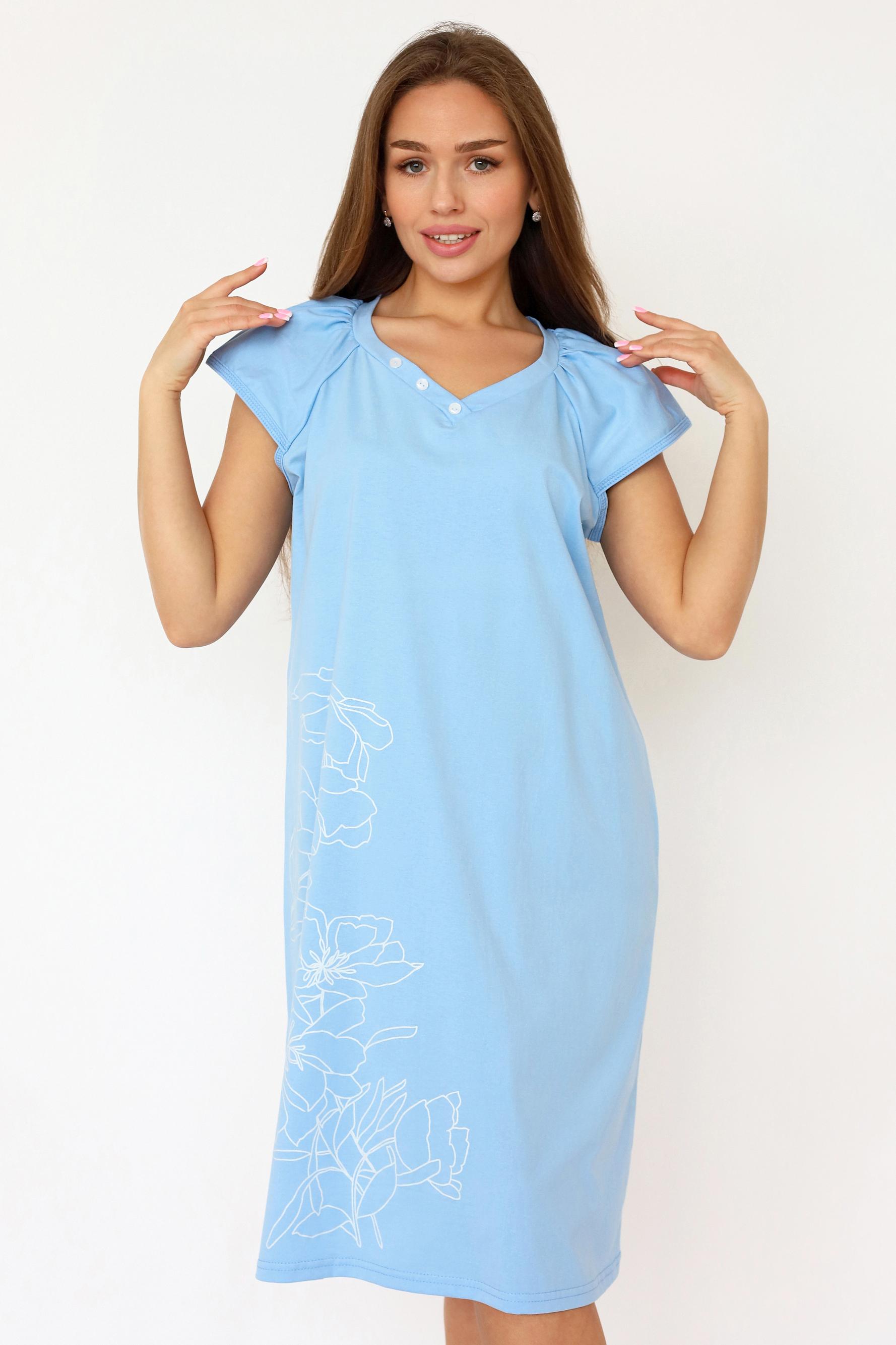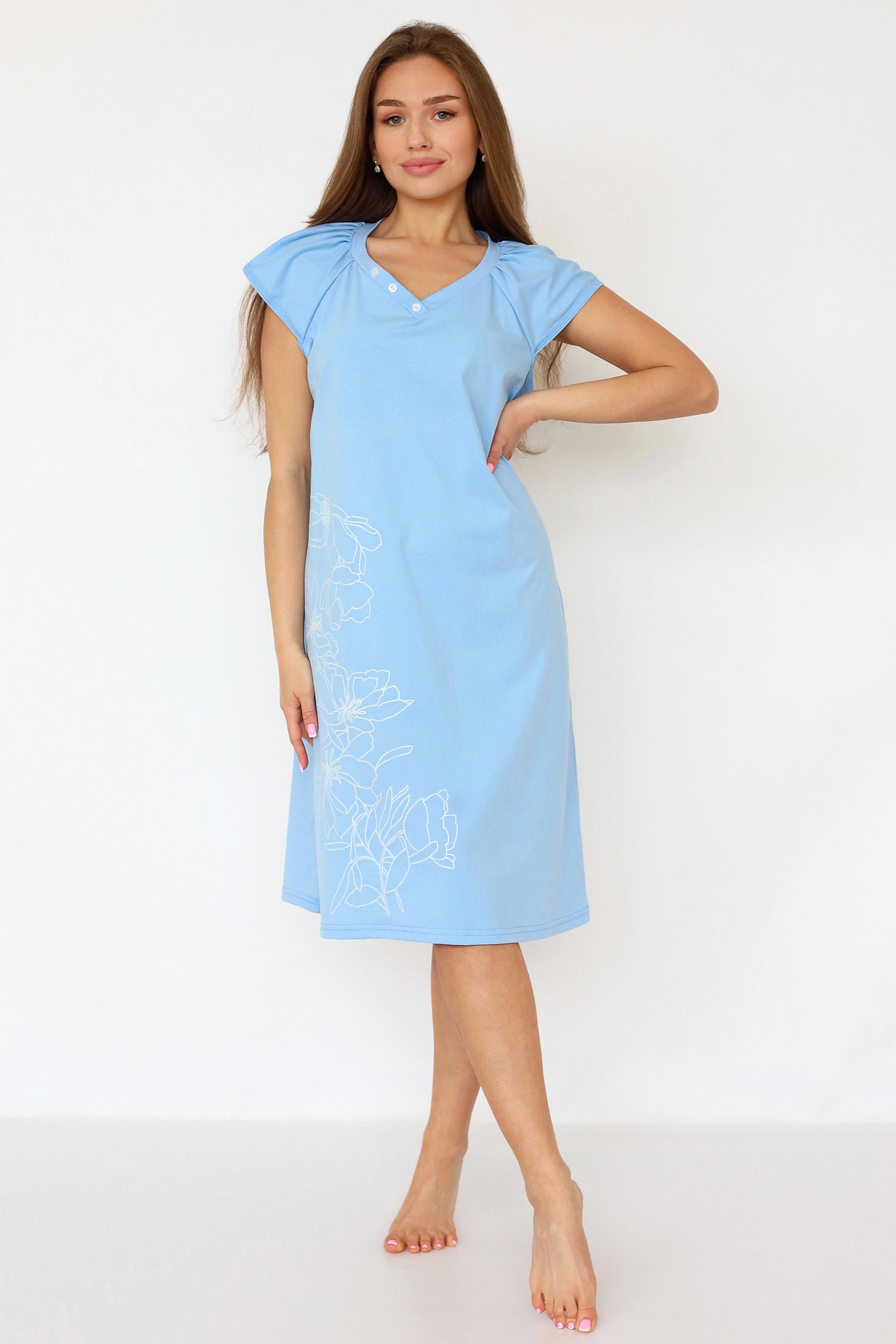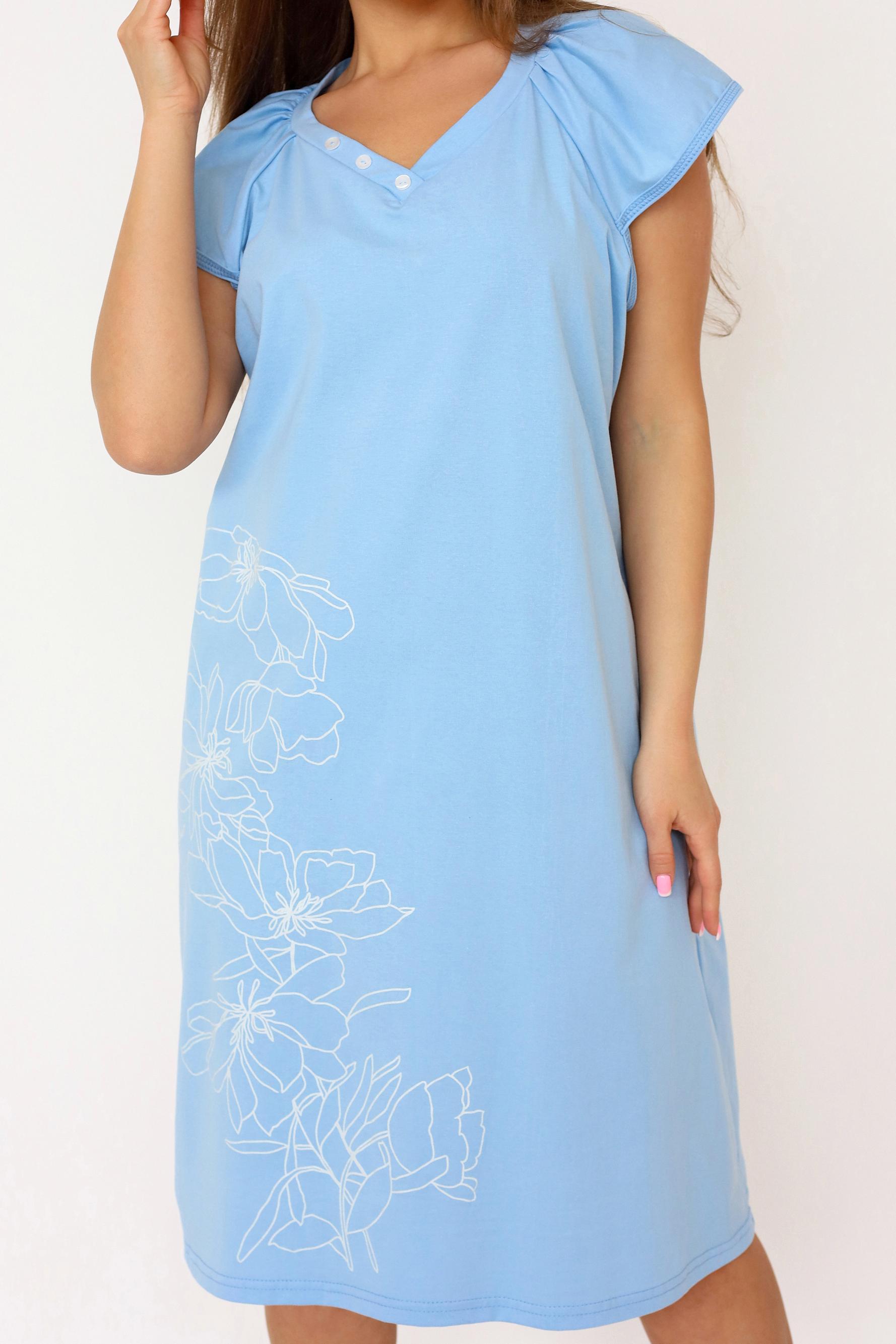 Женская ночная сорочка прямого кроя из качественного хлопкового полотна. Состав ткани и крой сорочки окунут вас в комфортный и сладкий сон. Сорочка с коротким рукавом – реглан. Красивый V-образный вырез горловины с декоративными пуговицами. Длина сорочки до коленей. Полочку украшает крупный принт в виде цветов.