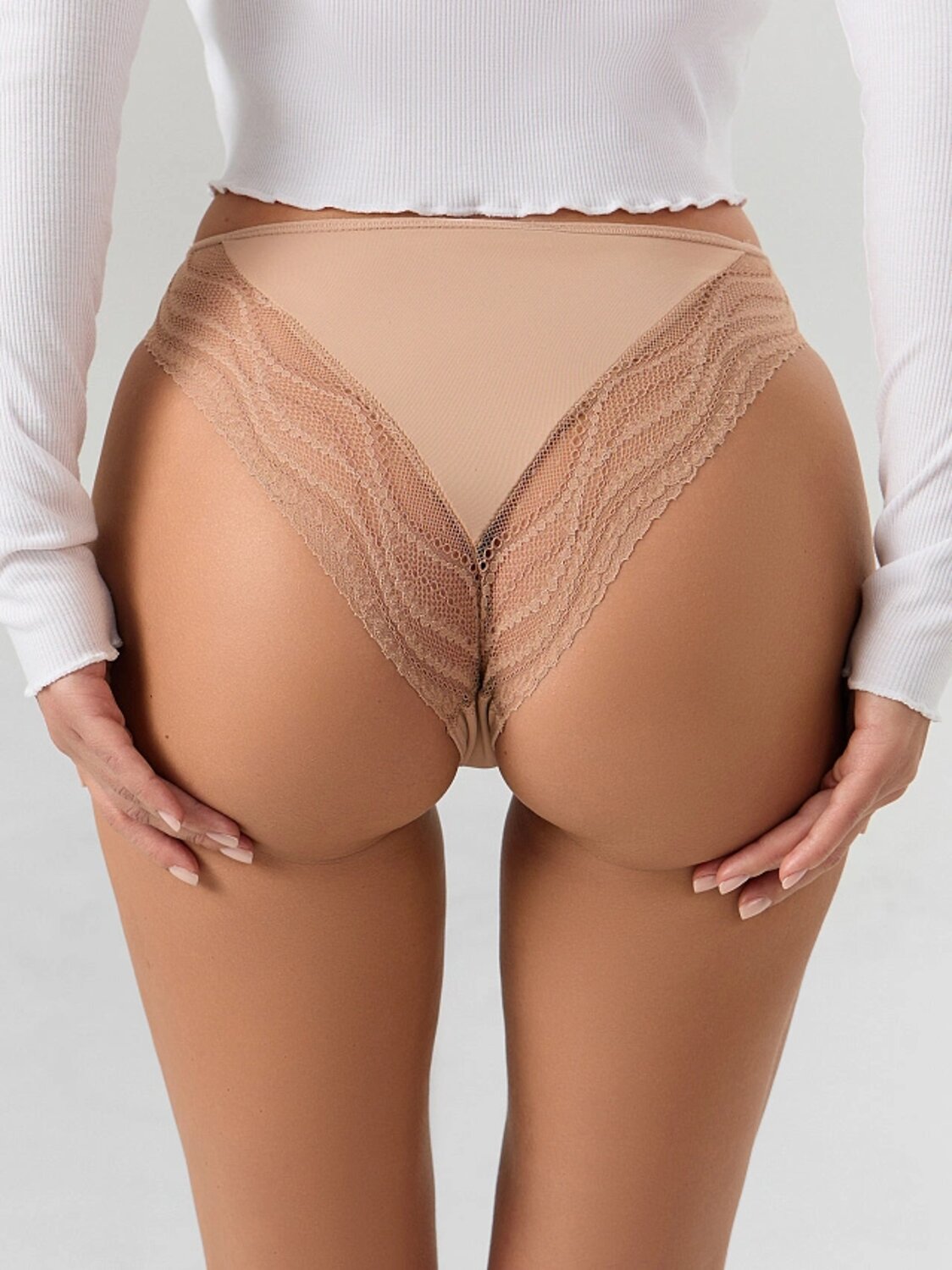 Комфортные слип-бикини из невесомой микрофибры и ажурного эластичного кружева на задней детали. Посадка по талии слегка занижена. На верхнем срезе и по ножкам – эластичная тесьма. Стильные трусики! телесный