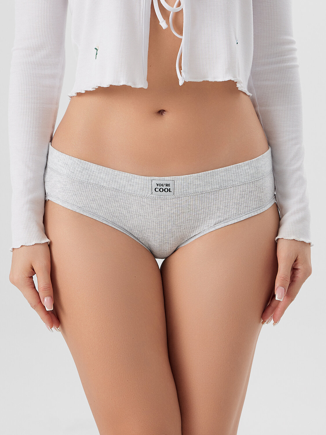 Трусы женские, средняя линия талии, силуэт - слипы. Передняя и задняя детали выполнены из рибаны. Верхний срез трусов обработан бейкой поперечной из рибаны, внутри жилка 6мм. Нижние срезы обработаны бейками поперечными из рибаны. Подкладка ластовицы из хлопка, отлетная по верхнему срезу. серый меланж+черный