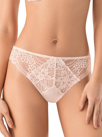 Оптовая продажа. Трусики-бразильяна со средней высотой линии талии, с шириной по бокам 5 см. Выполнены из гладкого сатина, нежного кружева и фактурной вышивки с растительным орнаментом. На задней детали декорированы переплетением эластичной тесьмой. Х/б ластовица.