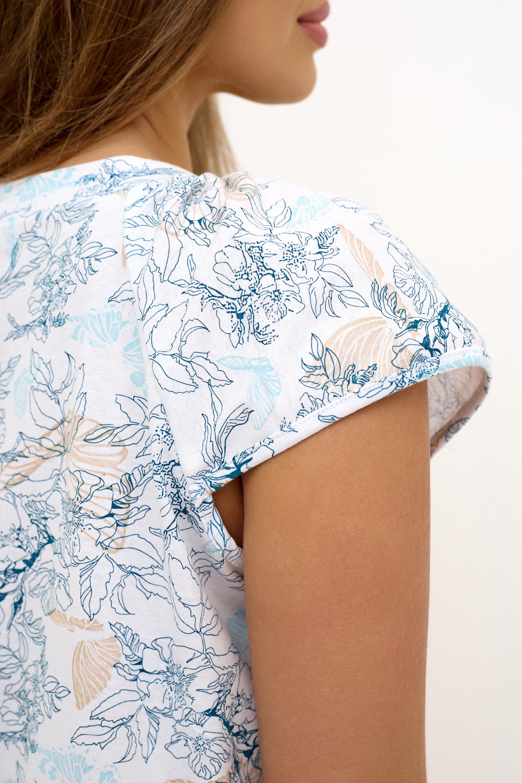 Женская ночная сорочка прямого кроя из качественного хлопкового полотна. Состав ткани и крой сорочки окунут вас в комфортный и сладкий сон. Сорочка с коротким рукавом – реглан. Красивый V-образный вырез горловины с декоративными пуговицами. Длина сорочки до коленей. Полочку украшает крупный принт в виде цветов.