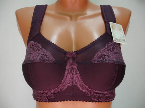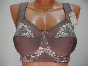не эластичного кружевного и сетчатого полотна в верхней части чашечки, без каркасов.  Нижняя часть чашечки продублирована изнутри хлопковой основой. Верхняя часть чашечки продублирована изнутри сетчатой основой. Спинка и стан выполнены из эластичного полотна. Бочек из эластичного полотна цельнокроен с передней частью бретели. Бюстгальтер имеет широкие разгрузочные бретели не стесняющие движений, которые снимают напряжение в области плеч благодаря уплотненной вставке из тонкого поролона. Бретель обтянута основной тканью. Задняя часть бретели выполнена из эластичной тесьмы. Регулятор длины бретели сзади. Высота бочка 12-17см. Застежка на три крючка, в зависимости от размера два-три варианта объема. Между чашечками на стане украшен маленьким бантиком.