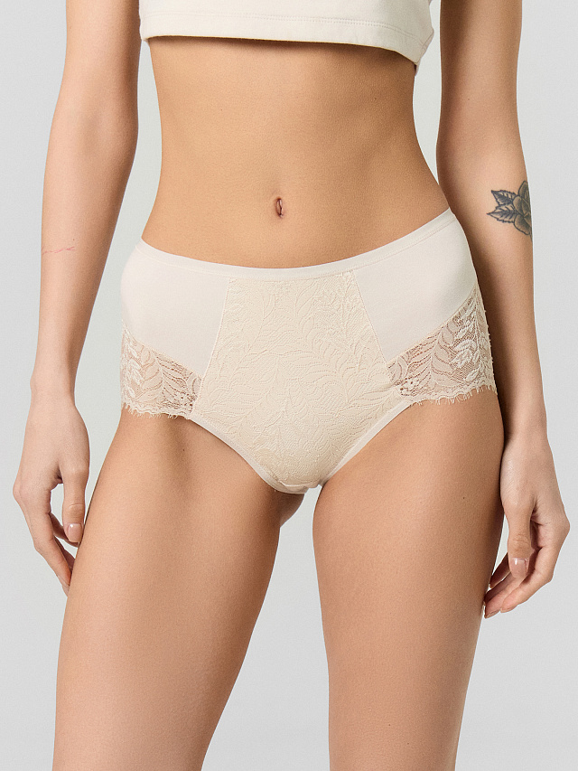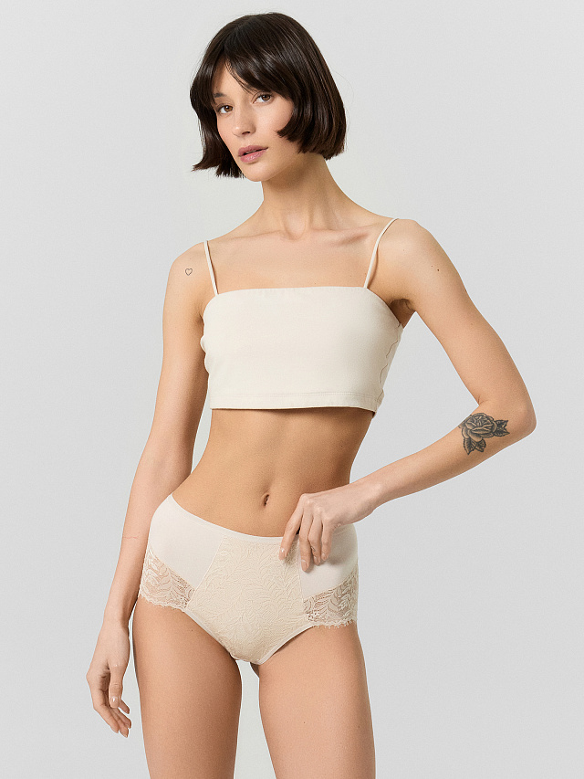 Передняя часть украшена кружевными вставками с вертикальным и горизонтальным членением, что добавляет образу изысканности. Задняя деталь со средним швом и декоративными линиями подчеркивает плавность изгибов. Все срезы обработаны мягкой эластичной тесьмой, которая предотвращает натирание и обеспечивает идеальную посадку. Ластовица на подкладке из основного материала гарантирует гигиеничность и дополнительный комфорт.