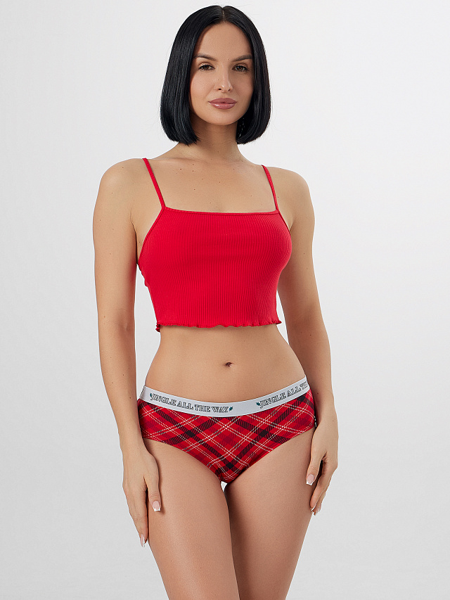 Модель отличается продуманной конструкцией. Передняя и задняя детали цельнокроеные, что обеспечивает гладкую посадку без лишних швов. Верхний срез обработан эластичной декоративной тесьмой с новогодним жаккардовым узором. Классическая средняя посадка на талии удобна для ежедневной носки. Внутренняя ластовица из основного материала гарантирует дополнительный комфорт и гигиеничность.