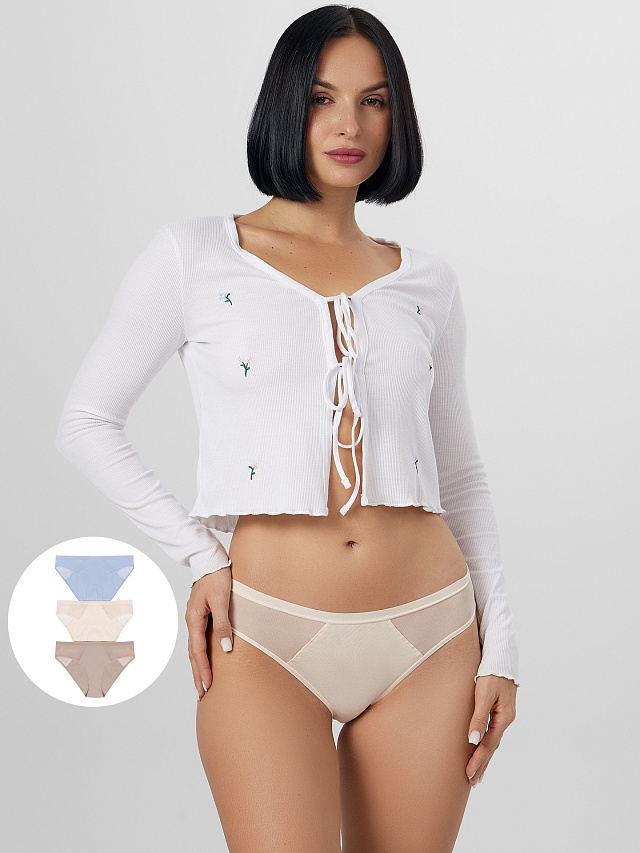 Набор из трёх пар станет практичным решением для тех, кто ценит удобство и элегантность в деталях. Нежные оттенки и продуманный крой делают эти трусики идеальным базовым бельём на каждый день.