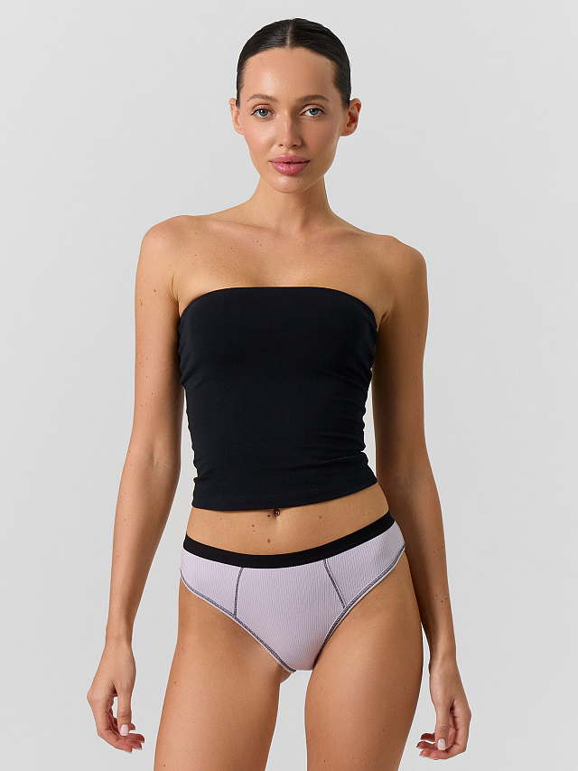 Трусы женские со средней линией талии силуэта «слип» из трикотажного полотна рибана. Передняя деталь с рельефами, по которым проложены декоративные строчки. Ластовица из кулирной глади отлетная по переднему срезу.