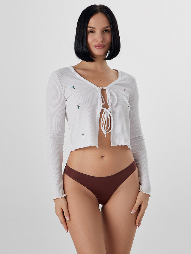 Трусы женские, средняя линия талии, силуэт - бразилиано. Передняя деталь выполнена из кружева. Ластовица из кружева на подкладке из хлопка. Задние детали выполнены из кружева. По верхнему срезу трусов жилка 6мм. По нижним срезам передней детали жилка. На передней детали декоративные обтачки из ткани.
