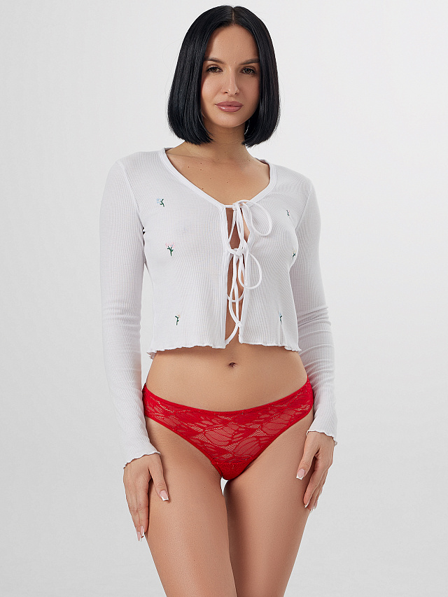 Трусы женские, средняя линия талии, силуэт - бразилиано. Передняя деталь выполнена из кружева. Ластовица из кружева на подкладке из хлопка. Задние детали выполнены из кружева. По верхнему срезу трусов жилка 6мм. По нижним срезам передней детали жилка. На передней детали декоративные обтачки из ткани.