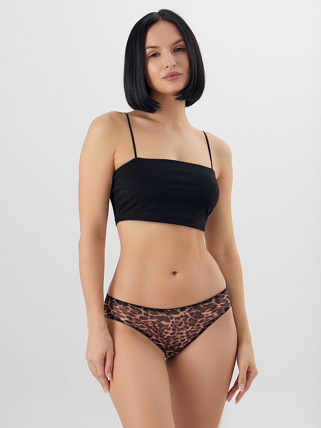 Слипы-бикини с леопардовым принтом из полупрозрачной сетки создают дерзкий и притягательный образ. Модель с классической линией талии обеспечивает комфортную посадку, мягко подчеркивая силуэт.