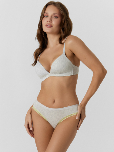 Слип-бикини базовой расцветки из хлопкового трикотажа и вставками из элегантного кружева по нижнему срезу. Линия талии чуть ниже классической. По поясу трусики окантованы эластичной тесьмой. Отличная модель со своей изюминкой!