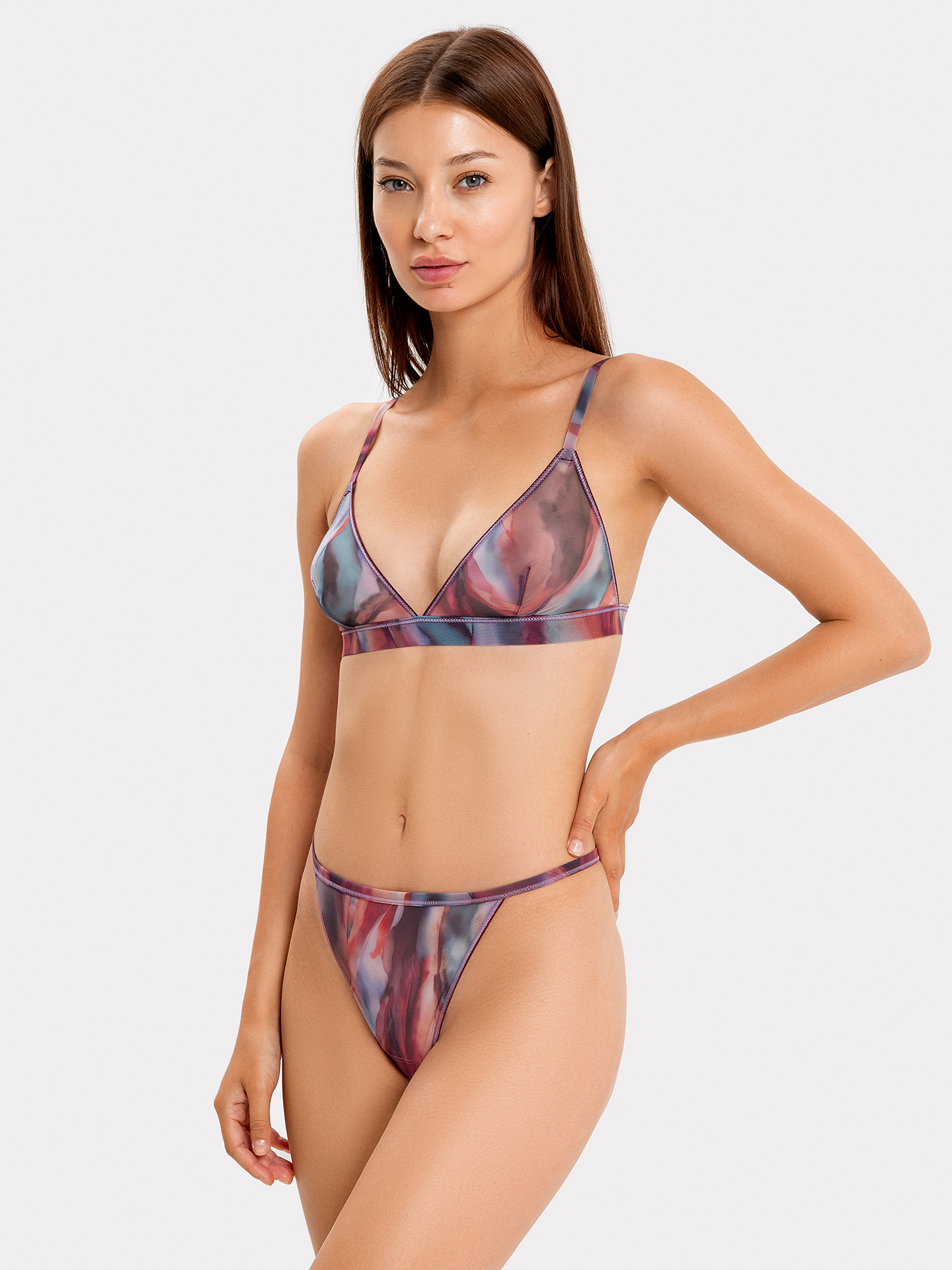 Трусы женские стринги в бежевом оттенке с принтом "акварель"