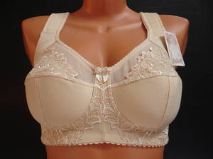 Бюстгальтер "балконет" с диагональным швом и  чашечкой на тонкой поролоновой основе, верхняя деталь бюстгальтера выполнена из эластичного кружевного полотна, нижняя деталь гладкая, с Т-образным швом, на каркасах.  Стан, бочка и спинка выполнены из эластичного гладкого полотна. Стан и бочка продублированы изнутри хлопковой основой. Бюстгальтер имеет боковые косточки. Высота бочка 7-10 см. Регулятор длины бретели сзади. Застежка от 75С на одном крючке, от 75D- 95E на два крючка, три варианта объема. Между чашечками на стане украшен маленьким бантиком.