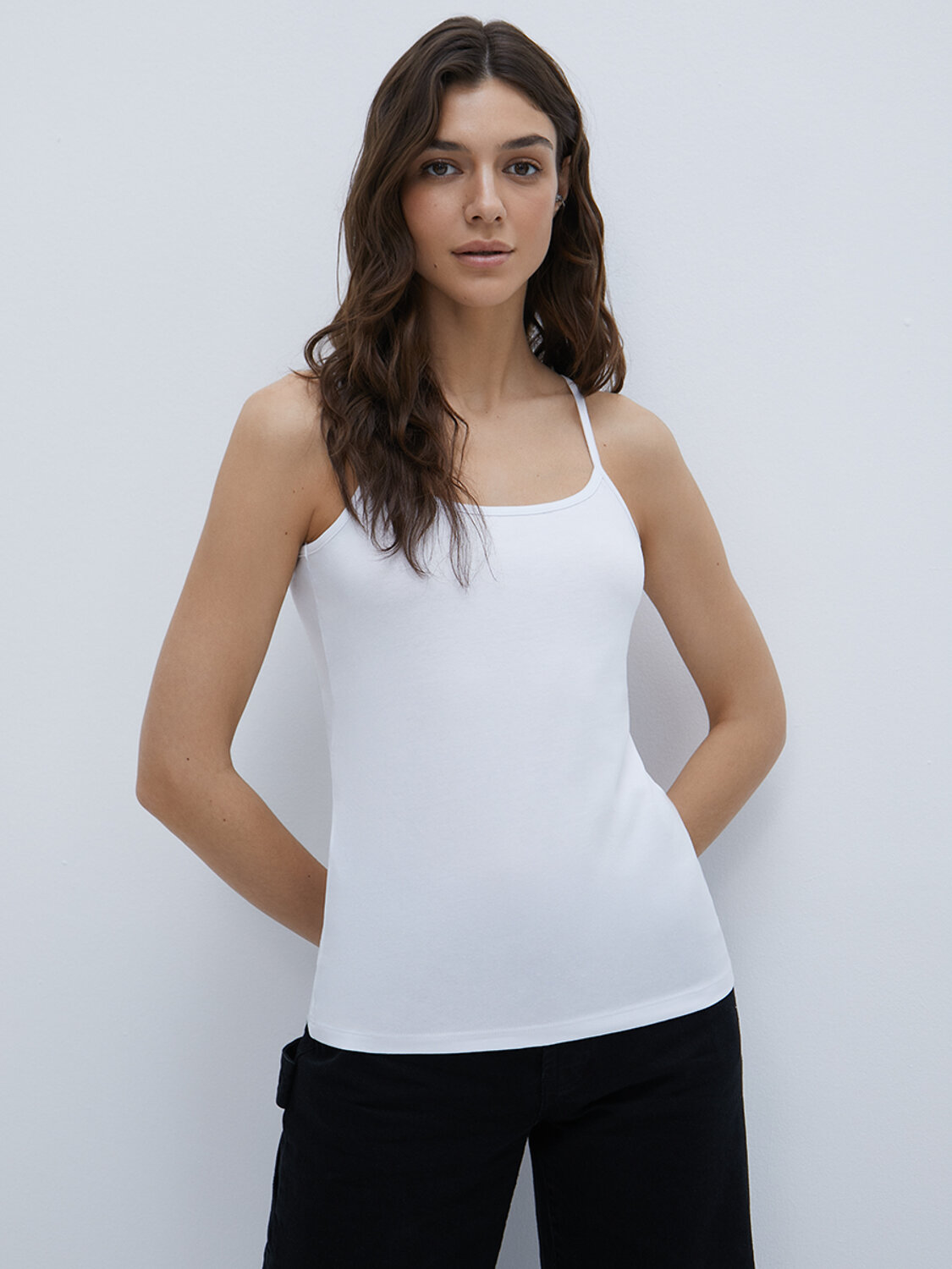 Женский топ на тонких бретелях. Выполнен из высококачественного хлопка, который позволяет коже дышать, отлично впитывает влагу и подходит даже для самой чувствительной кожи. Добавление эластана позволяет создать полуприлегающий силуэт и способствует длительному сохранению формы и цвета.