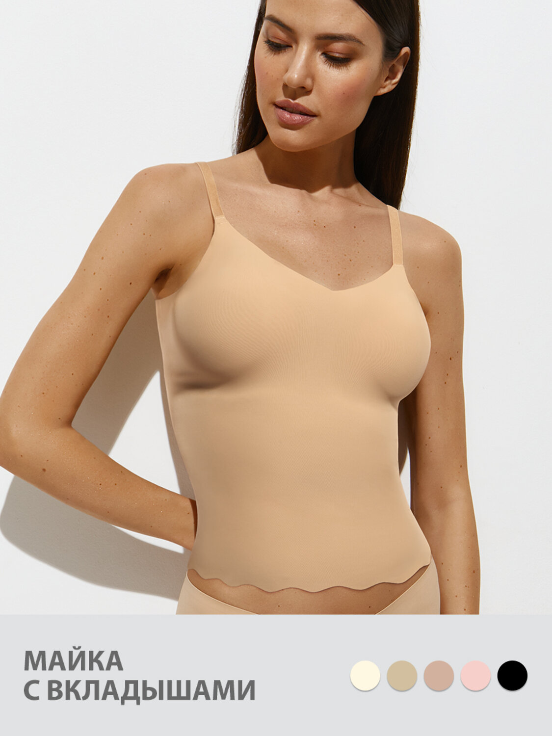 Базовая майка на тонких регулируемых бретелях с V-образным вырезом спереди. Подчеркивает грудь и придает ей округлую форму.
