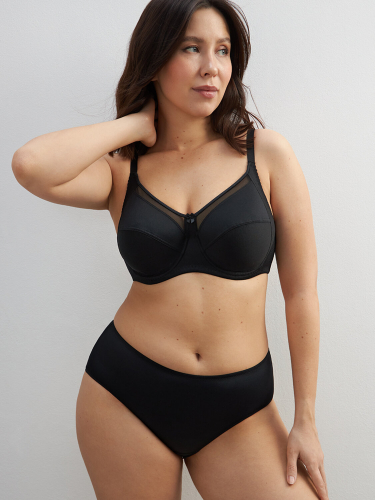 Бюстгальтер с мягкой чашкой и боковой корректирующей деталью, на каркасах. Внутренняя деталь чашки дублирована хлопком. Высокая центральная деталь усиливают поддержку груди. Бюстгальтер выполнен из трикотажного полотна трилобал*, верхний край чашки декорирован сеткой.