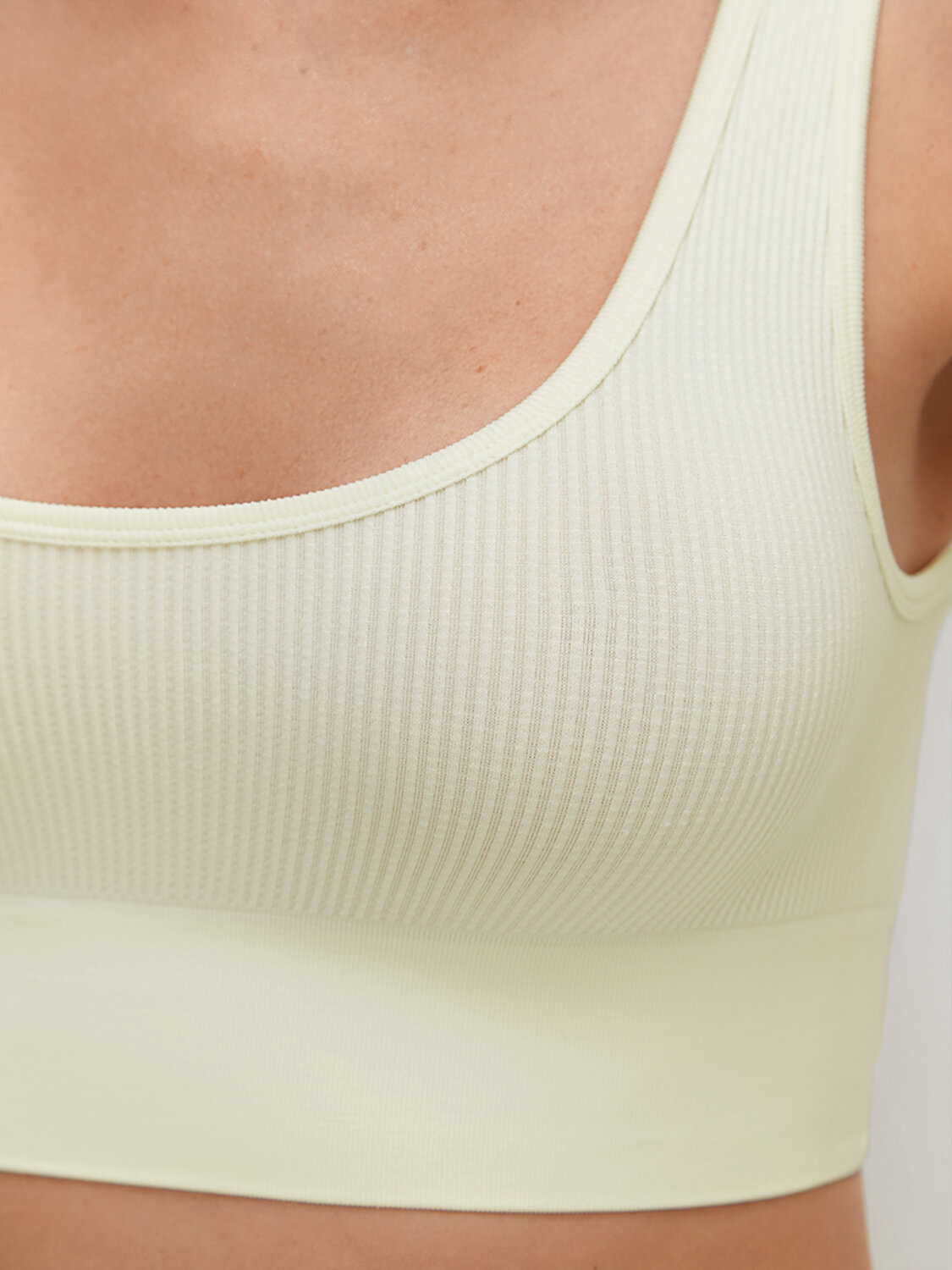 Бесшовный топ из микрофибры с вафельным плетением на широких бретелях. Материал в составе обладает нежной текстурой, приятно ощущается на теле, превосходно пропускает воздух, впитывает влагу, хорошо сохраняет форму и цвет. Отсутствие застежек и косточек обеспечивает максимальный комфорт и превосходное облегание.