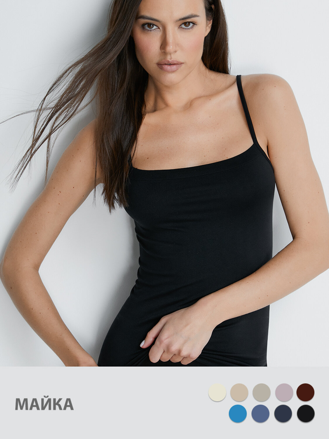 Женская майка из микрофибры на тонких бретелях. Материал в составе обладает нежной текстурой, приятно ощущается на теле, превосходно пропускает воздух, впитывает влагу, хорошо сохраняет форму и цвет.