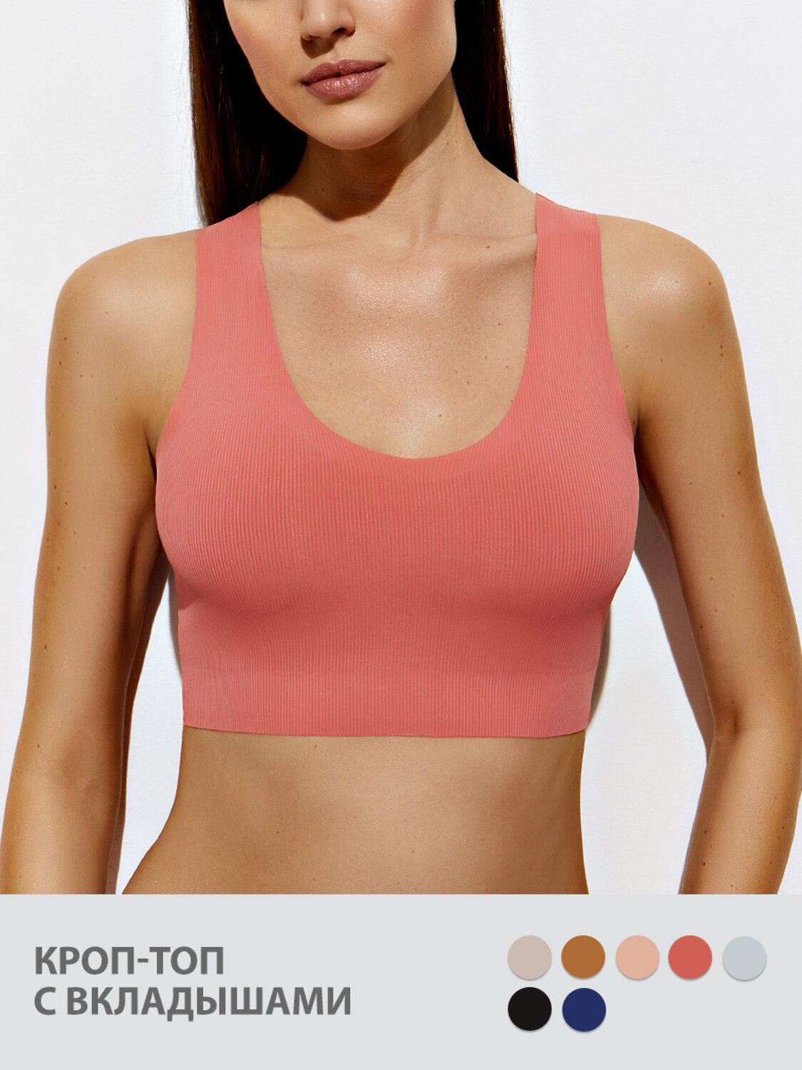 Кроп-топ в рубчик на широких бретелях со съемными вкладышами. Придает груди округлую форму и подчеркивает естественный силуэт. Изготовлен из мягкой фактурной микрофибры с использованием термоклеевой обработки края. Материал обладает высокой воздухопроницаемостью, приятно ощущается на теле, хорошо сохраняет форму и цвет. Топ комфортно облегает и обеспечивает полную свободу движений.