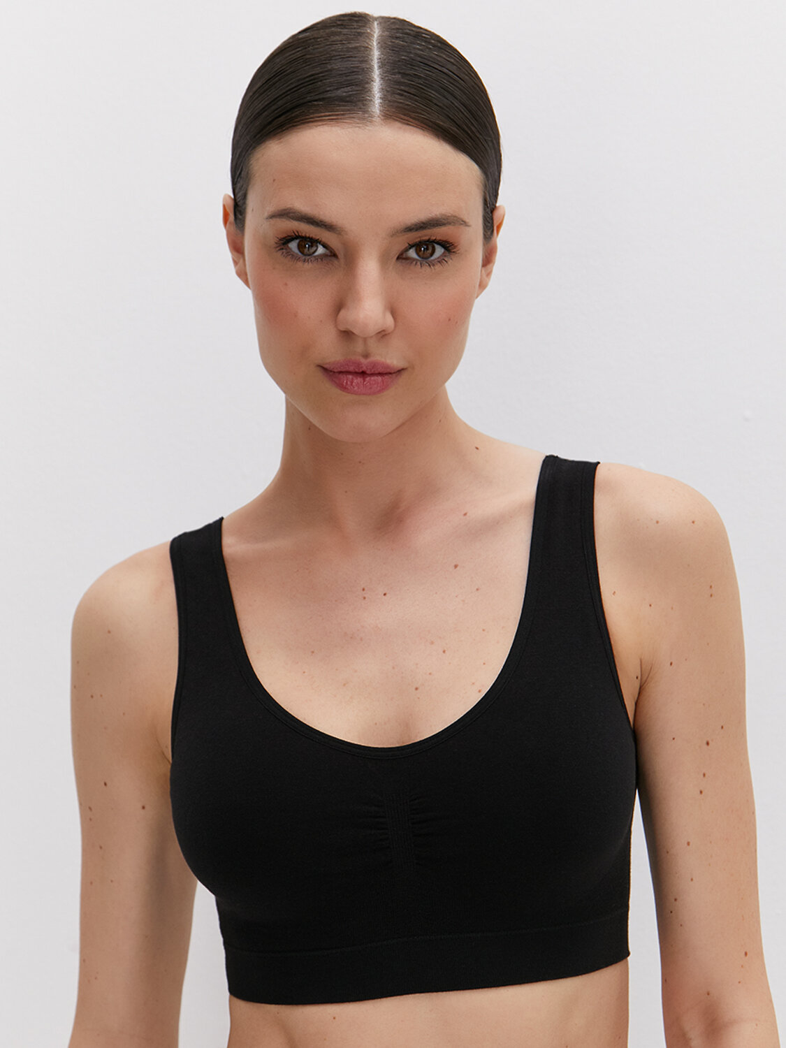 Превосходно облегает и обеспечивает надежную поддержку благодаря вывязанной резинке и отсутствию боковых швов. Съемные анатомические вкладыши создают дополнительный комфорт и позволяют изящно подчеркнуть зону декольте. Вырезы горловины и проймы окантованы эластичной тесьмой.
