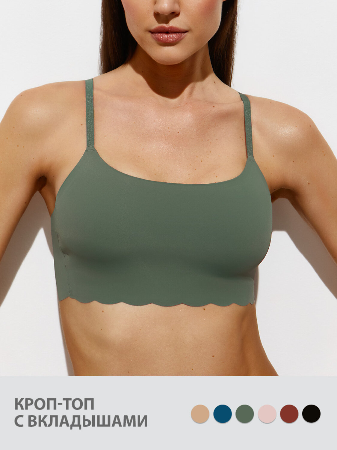 Стильный топ на тонких регулируемых бретелях со съемными мягкими формованными вкладышами. Эффектно подчеркивает грудь и придает ей изящную округлую форму.
