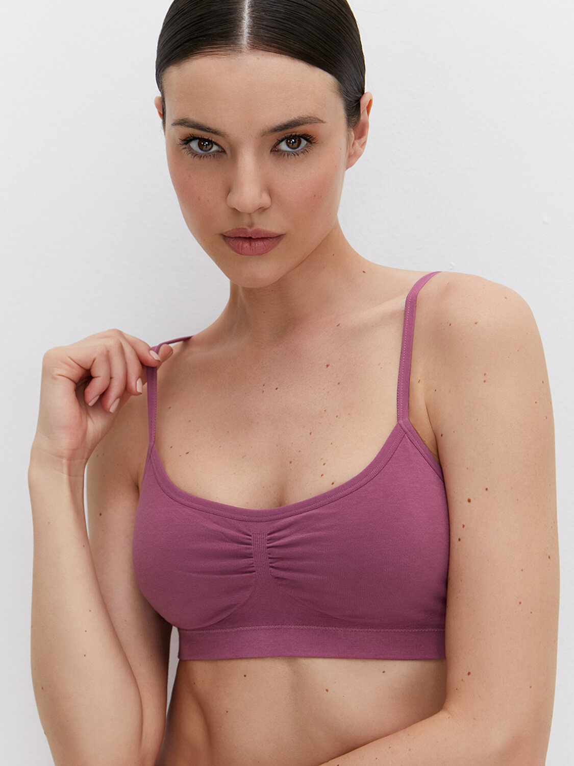 Бесшовный топ на тонких регулируемых бретелях. Изготовлен из высококачественного хлопка, который отлично пропускает воздух, хорошо впитывает влагу, приятно ощущается на теле и подходит для чувствительной и нежной кожи.