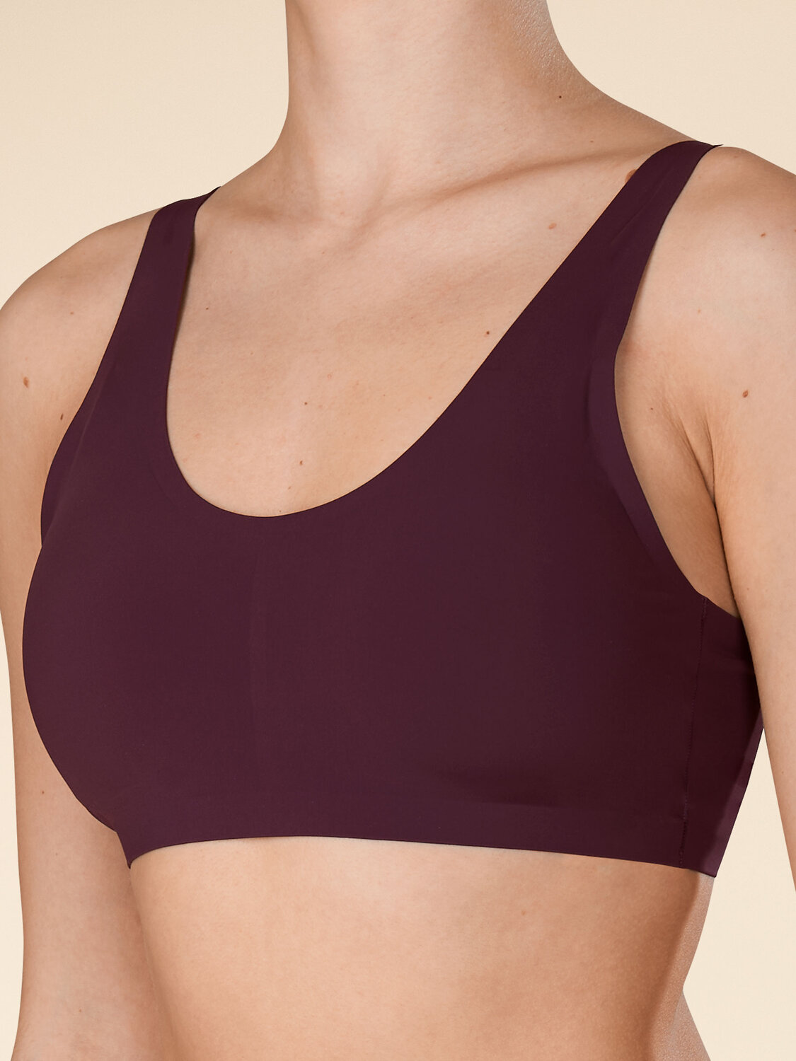 Женский бельевой топ. Изготовлен по бесшовной технологии с минимумом швов. Боковые плоские раздвижные швы, края горловины, проймы и низа изделия подогнуты и приклеены. Топ максимально невидим под одеждой, не натирает, комфортно сидит на теле. Съемные формованные чашки поддерживают грудь и создают красивый объем. Продуманное расположение регулируемых бретелей по спинке делают топ комфортным в носке, лямки не спадают с плеч. Этот топ станет идеальным функциональным нижнем бельем на каждый день.