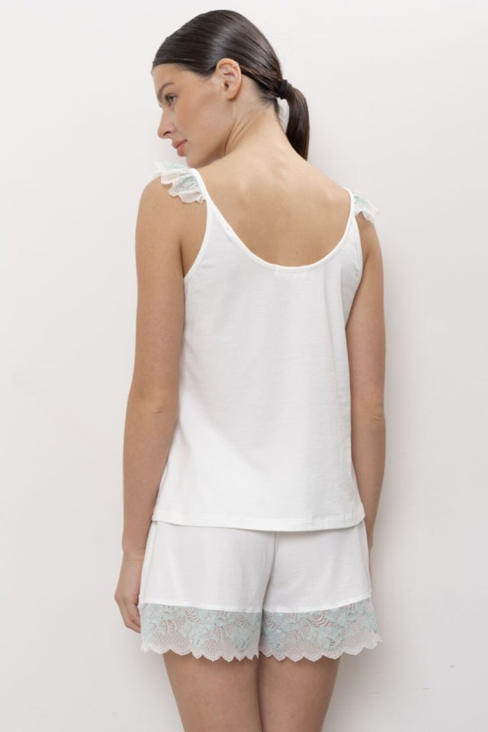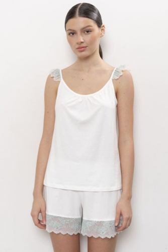 Пижама женская состоит из топа на тонких бретелях, декорированных кружевом в виде воздушных «крылышек». Вырез горловины круглый, слегка присборен. Шорты свободного прилегания на мягкой резинке. Комфортны и удобны в носке. По низу шорт нежное кружево.