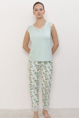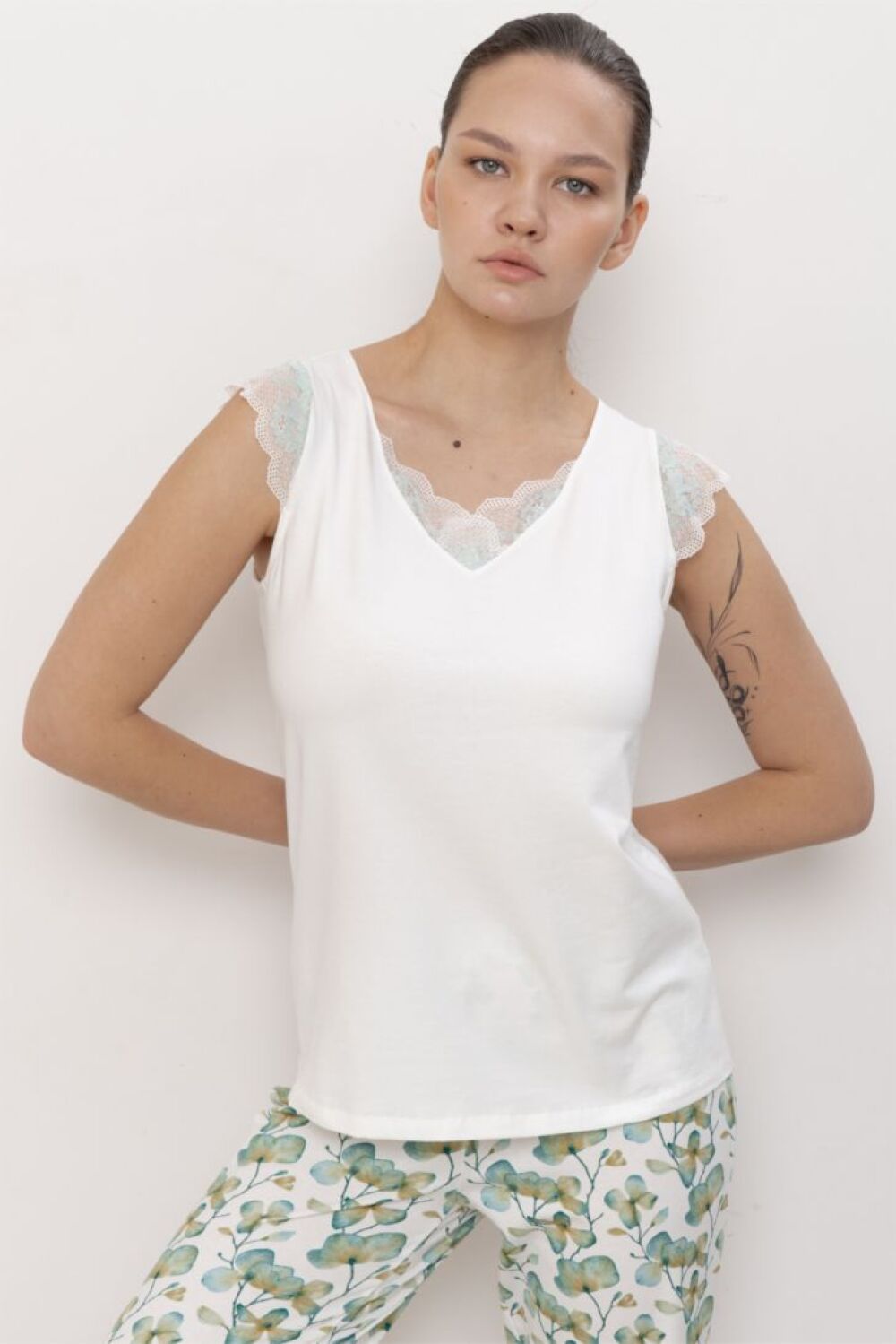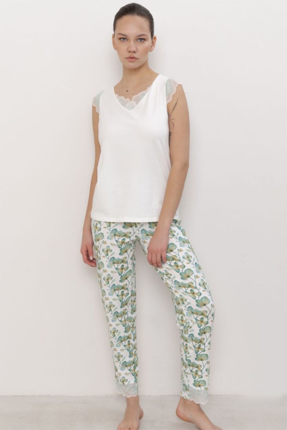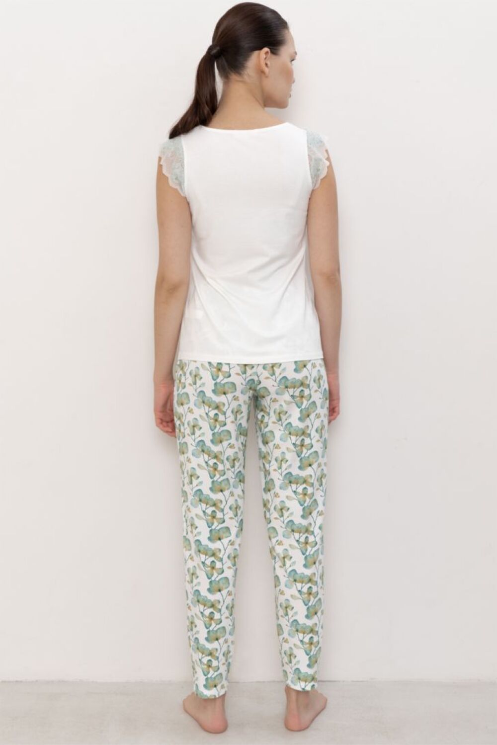 Пижама женская состоит из топа на широком плече и брюк, зауженных к низу. Вырез горловины топа V-образный, декорирован кружевной вставкой. Пройма декорирована кружевом. Брюки свободного прилегания, заужены к низу. Пояс – мягкая резинка. По низу брюк кружевные вставки.